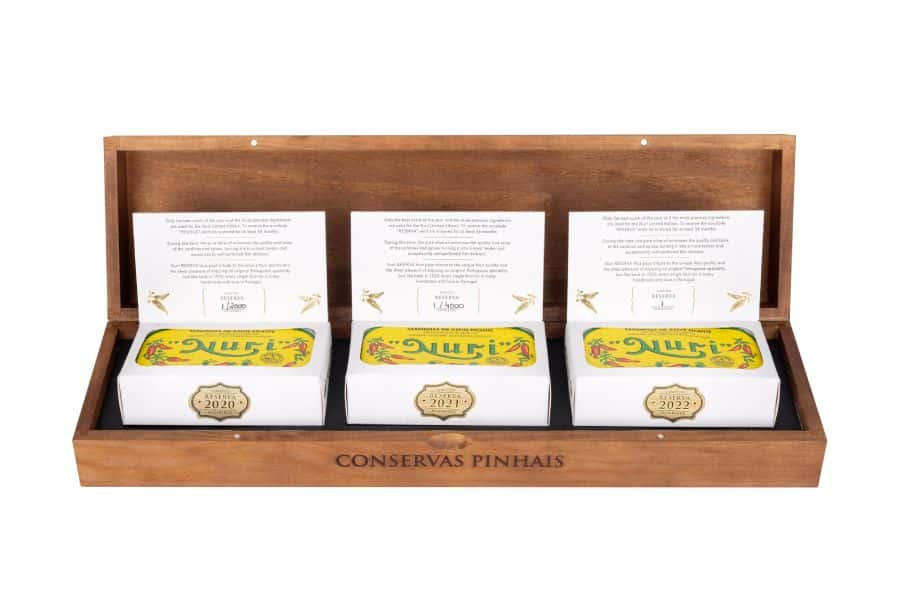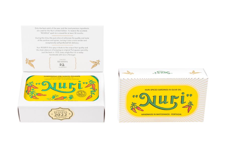 Para a edição limitada NURI são utilizados apenas as melhores sardinhas do ano e os ingredientes mais frescos. Para receber a distinção de “RESERVA”, cada lata é conservada durante pelo menos 36 meses. A NURI RESERVA presta assim homenagem à qualidade única NURI e ao prazer de saborear uma especialidade portuguesa original.